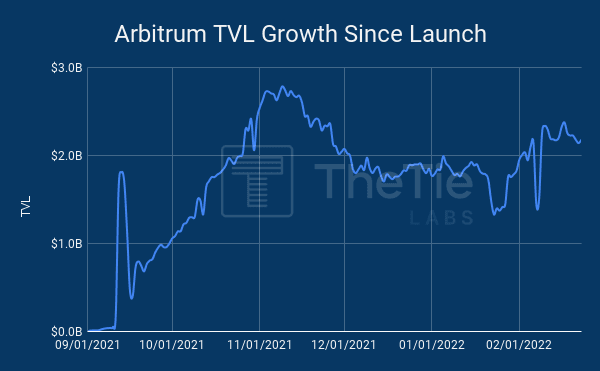 We are able to visualize the TVL growth of all the projects built on Arbitrum’s ecosystem since its inception. Above, we notice the initial jump in bridge inflows starting September 2021, when the mainnet was launched to the public. Although it took a bit of a dive, it has maintained relatively steady growth ever since. This is just the beginning for Arbitrum and as more projects begin to choose to integrate L2 scaling options, Arbitrum should continue to see growth.