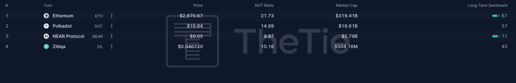 Among the many metrics SigDev™ provides, I’ve chosen to examine the various protocols that have or are planning to adopt sharding as a scaling solution. Here we can see the disparity between Network Value to Transaction (NVT) ratio and the Long Term Sentiment versus the market caps. Evidently Ethereum leads in market cap, followed by Polkadot, then NEAR. This makes sense as the price of each of the former is higher. We can standardize by looking at the NVT ratio, which is the ratio of market capitalization divided by transacted volume. This shows us that the NVT ratio of NEAR is significantly lower than its peers, while at the same time carrying a higher long term sentiment! This would seem to indicate that NEAR is undervalued at its current price.