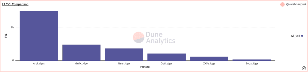 When comparing TVL’s of Layer 2s in general, we can see that Arbitrum leads the pack. Arbitrum has established itself as the premier L2 scaling solution, with 54% of the market share and nearly $3.04B in TVL. It's likely that developers will be more attracted to it versus, say, Optimism, which also uses the Optimistic rollup framework. When evaluating long term growth potential, it's best to look toward where building is actually happening. For Arbitrum, that's Treasure DAO, Jones DAO and Dopex.