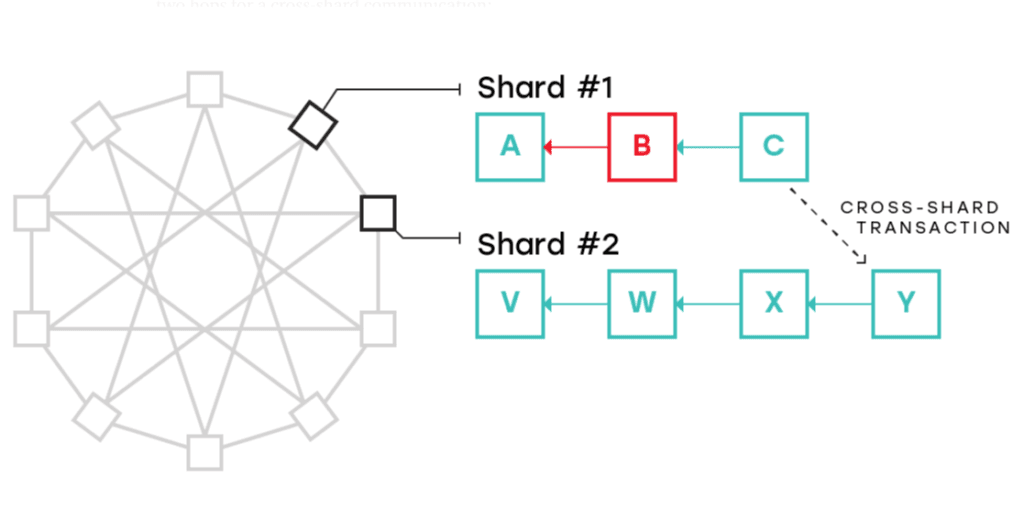 A workaround to this situation is to arrange the shards in an undirected graph, in which each shard is connected to several other shards. Each shard is only allowed to transact with neighboring shards. In the event a shard needs to transact with a non-neighbor shard, the transaction is routed between multiple shards where nodes in each shard have to validate all the blocks in their shard, as well as their neighbor’s blocks.