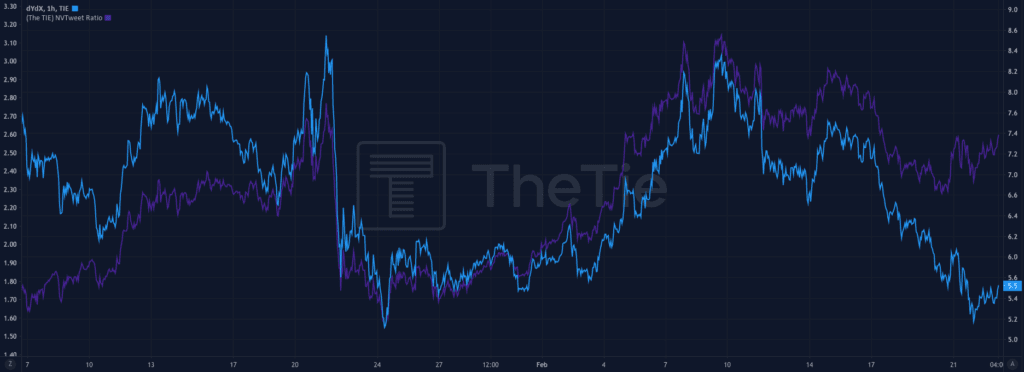 Complementing this, we return to the charts to analyze TheTie’s formulated NVTweet Ratio (not to be confused with the previously discussed NVT). The NVTweet Ratio looks at how many tweets a particular coin has per each $1M in Market Cap. The lower a coin's NVTweet Ratio, the more tweet volume it has per $1M in market cap. An increasing NVTweet Ratio could suggest that a particular coins' market is becoming increasingly driven by institutional trading. As market cap is increasing faster than social volume, this may be telling of less retail involvement in the market for a particular coin.
