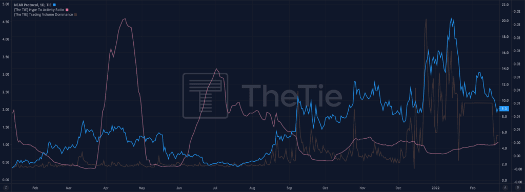 We see that most of the growth and volatility occurs during periods of great activity and muddled hype. Early on, while volume and price are relative low, hype-to-activity peaks at a roughly 4.5:1 ratio. This indicates lots of discussion but no real development in price action. This is followed again during the summer months, but the trend quickly inverses around December; with volume and price rising while hype-to-activity falls below a 1:1 ratio. With this, we come to a counterintuitive diagnosis for NEAR: while twitter fingers may be hot and bothered, hype may actually have an inverse correlation with price.
