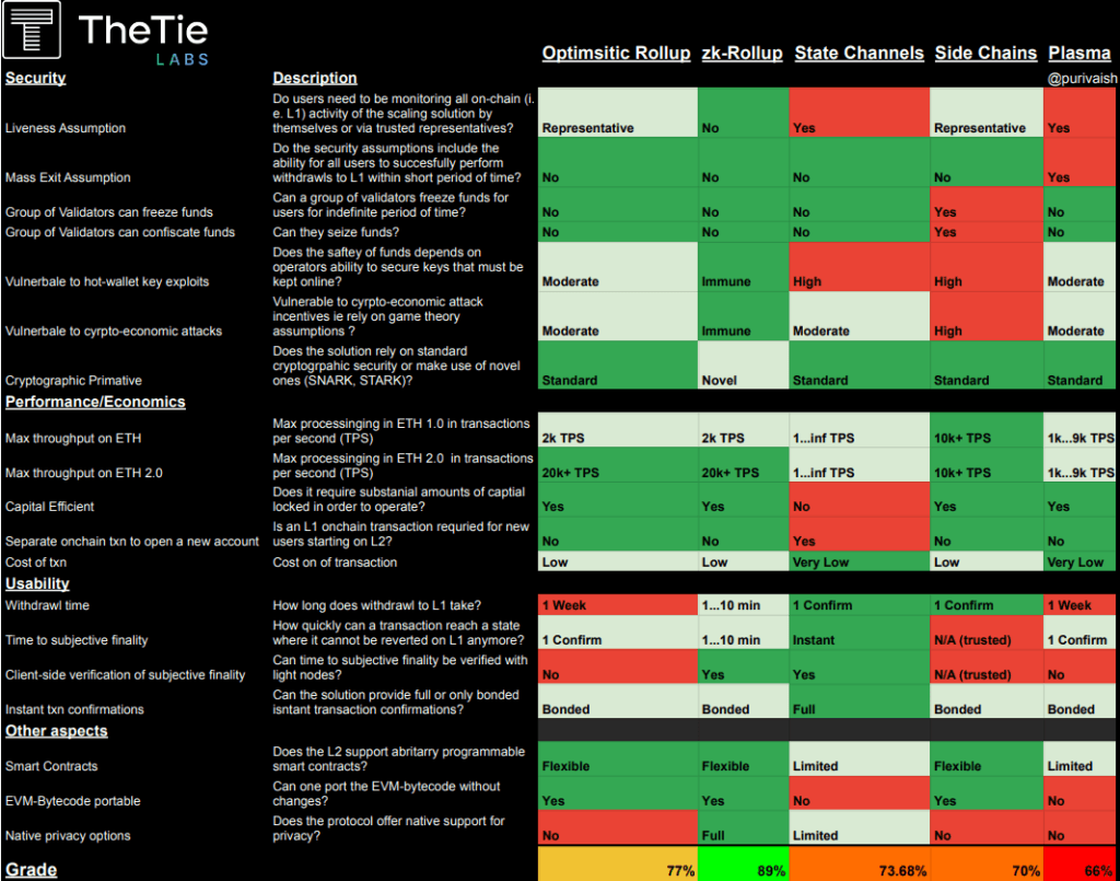 As we can see, the heat map displays each solution's strengths and weaknesses. For the final grading of each solution, I assigned a value of 1, 2, or 3 to each cell based on red, light green, and dark green respectively. As a result, the best score an L2 solution could get would be 57, and we can see that zk-rollups performed the best and met most of the needs and challenges.