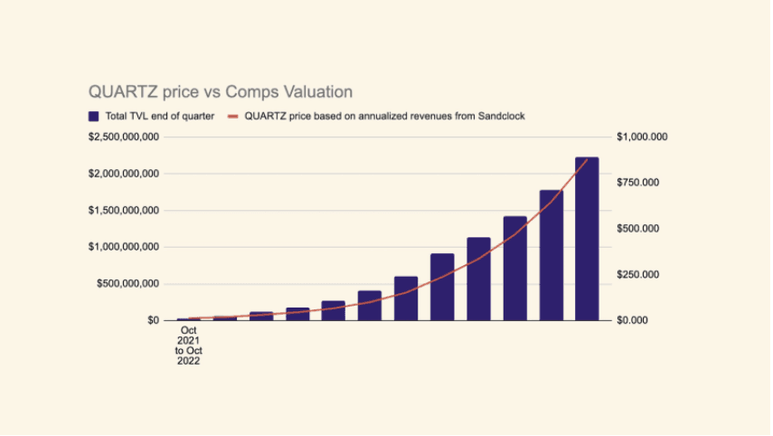 As shown in Figure C, Sandclock's native governance token, QUARTZ, is extremely responsive to TVL. Based on the team’s valuation model, at $500mm TVL, the price of QUARTZ would be pegged at around $250.00, a 2821% price increase from its current price of $8.86. With that said, these estimated projections do not necessarily consider the full scope of the value accrual mechanisms for QUARTZ in either direction.