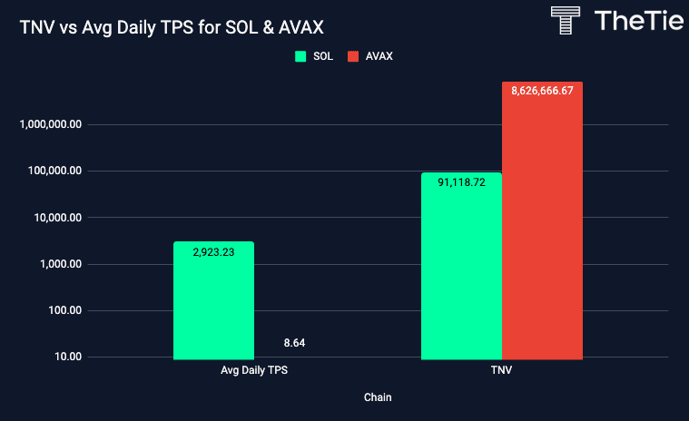 When looking at just TPS, Solana seemingly has a big leg up on other chains. Let’s compare how TNV differs from TPS in the case of Solana vs Avalanche.