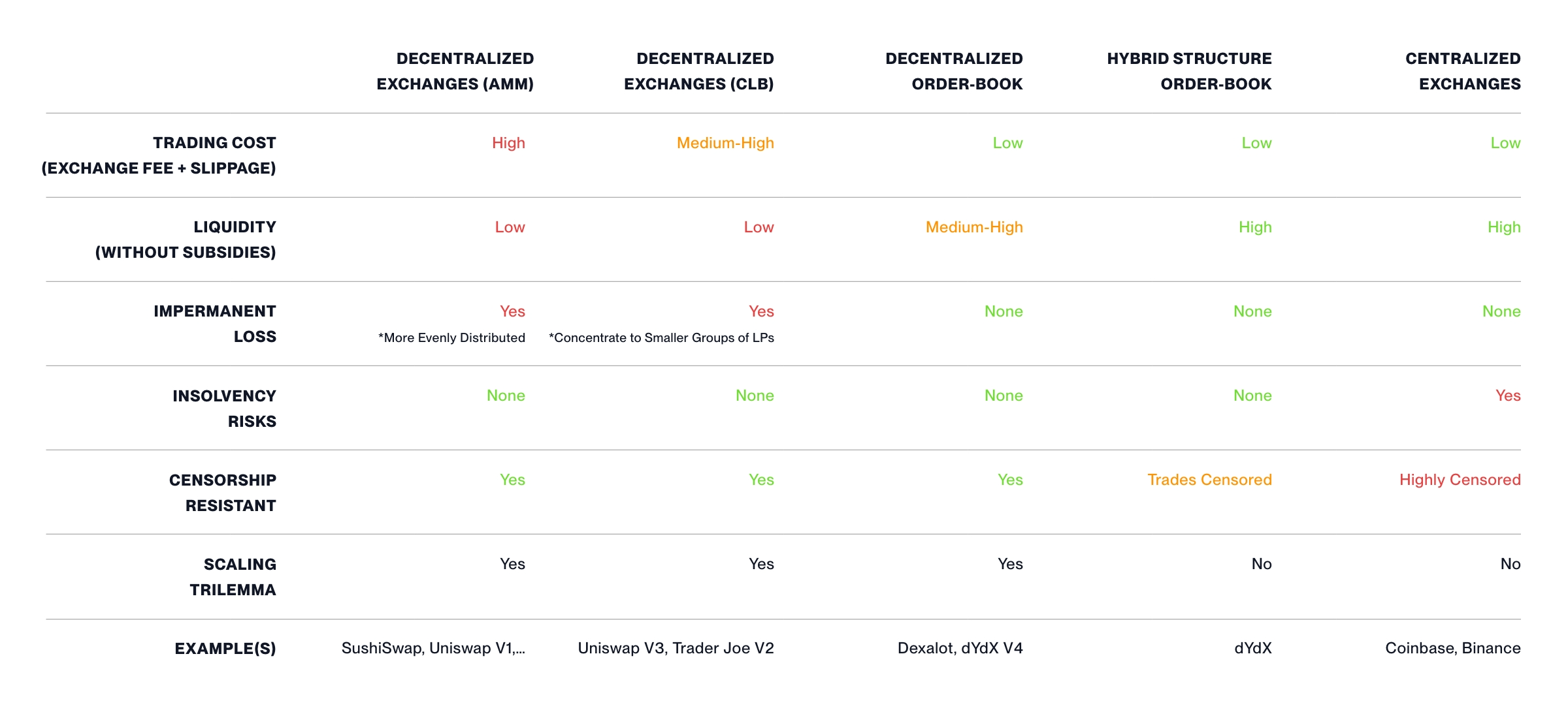 Whether it's AMM, decentralized liquidity books, or hybrid structures like dYdX, each approach has its pros and cons. Which model will ultimately prevail in the crypto space? This piece will explore these tradeoffs in detail while looking toward the future with an investigation of innovative mechanisms within the DEX space.
