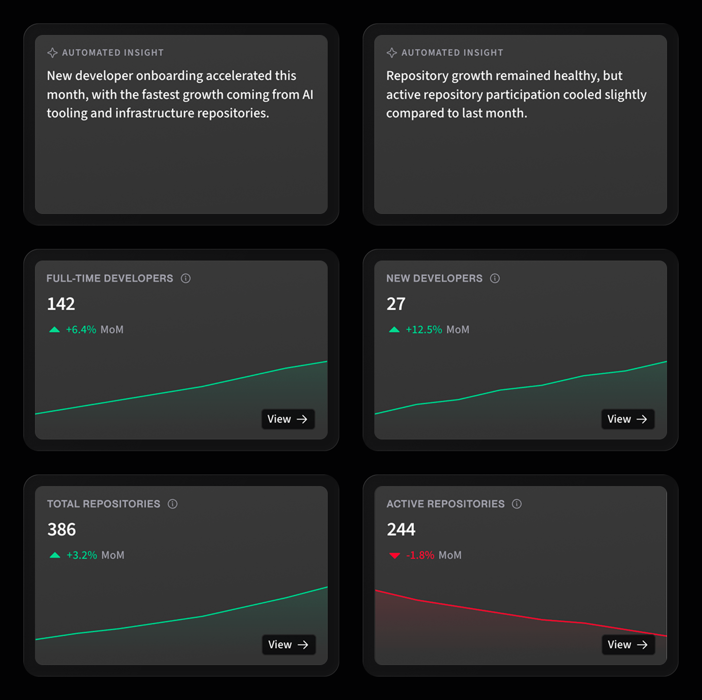 Alongside the KPIs, automated insight cards surface the most notable recent shifts, such as accelerating onboarding or cooling repository participation. Together, these provide a rapid orientation before diving into the more detailed sections below.