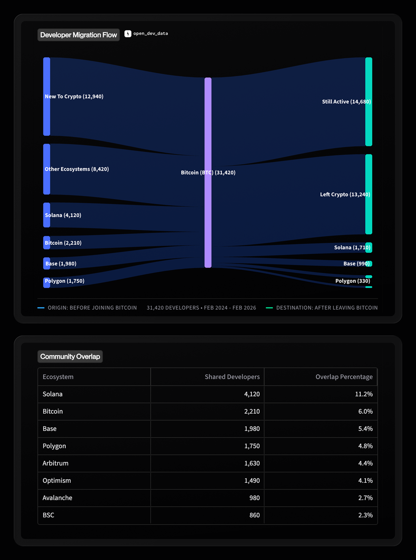 Rather than providing a single activity metric, they break developer data down across multiple dimensions: contributor depth, retention, codebase momentum, and cross-ecosystem talent flow. Each is benchmarked against crypto-wide averages so users can evaluate a project in context, not in isolation.