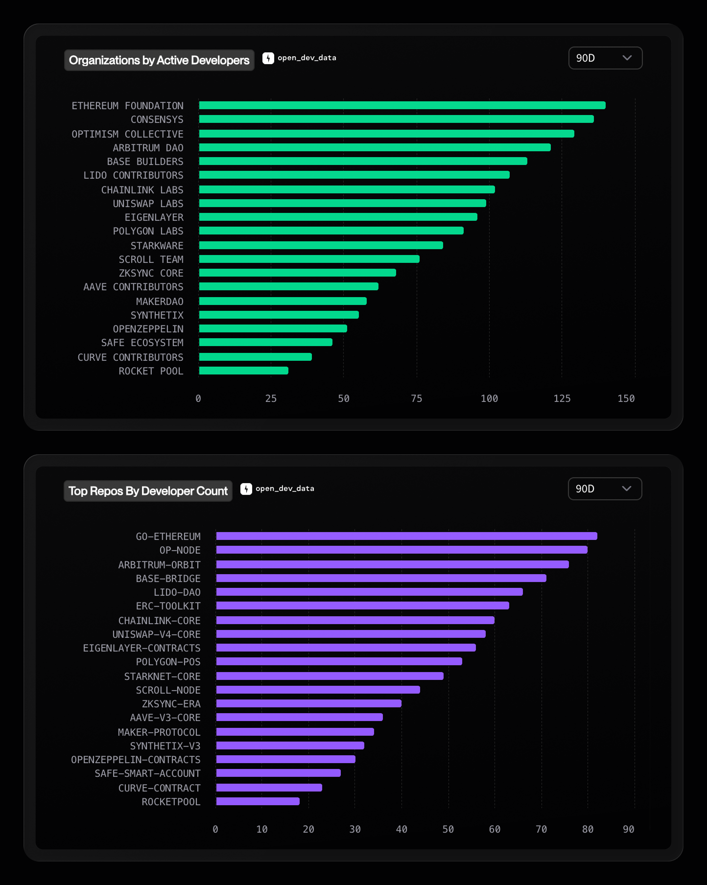 The final section ranks crypto organizations and repositories by active developer count, giving users a view of how developer output is distributed across the broader ecosystem. This makes it easier to spot core anchors within an ecosystem, identify emerging projects gaining contributor traction, and assess whether development activity is broadly distributed or concentrated among a few teams.