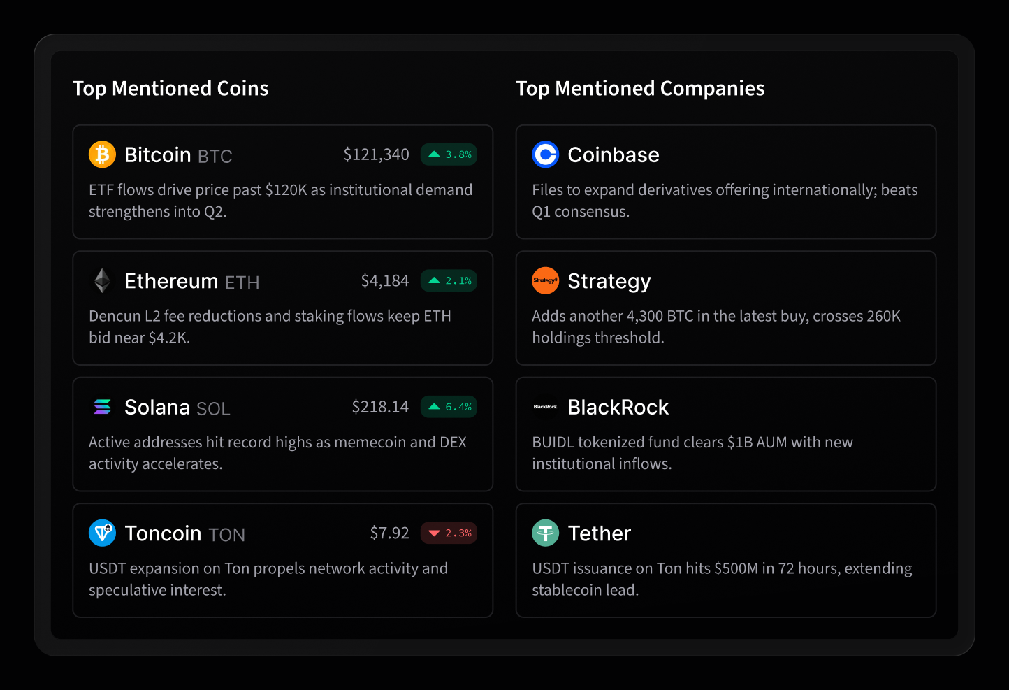 The homepage also surfaces which specific coins and companies are driving the conversation at any given moment. Rather than searching for what is relevant to an asset you are watching, you can see which assets are generating the most coverage and why, with a timeline showing how each story developed.