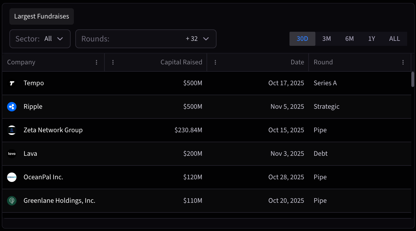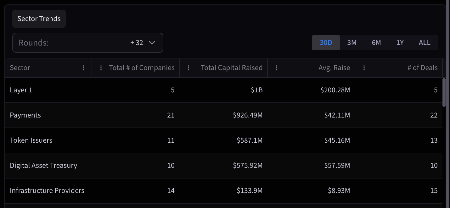 - Meanwhile Digital Asset Treasury companies raised $575.92M, averaging $57.59M per raise