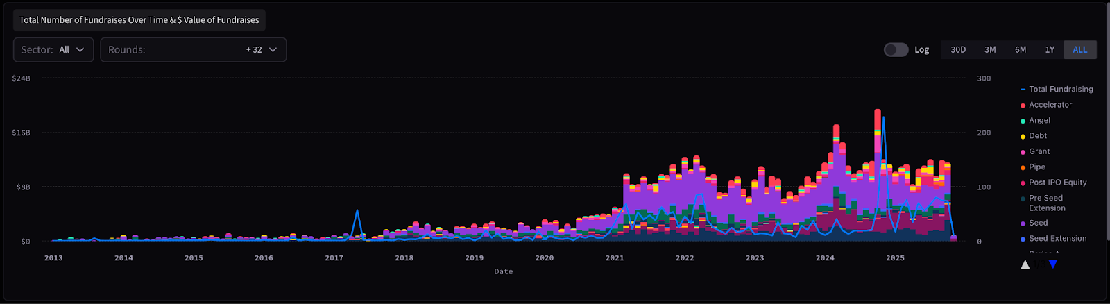 Every round is verified and linked to the correct entity, so large transactions no longer inflate totals through duplicates or token rebrands. The Tie Terminal users can break down by sector and round type to see where capital is being deployed.