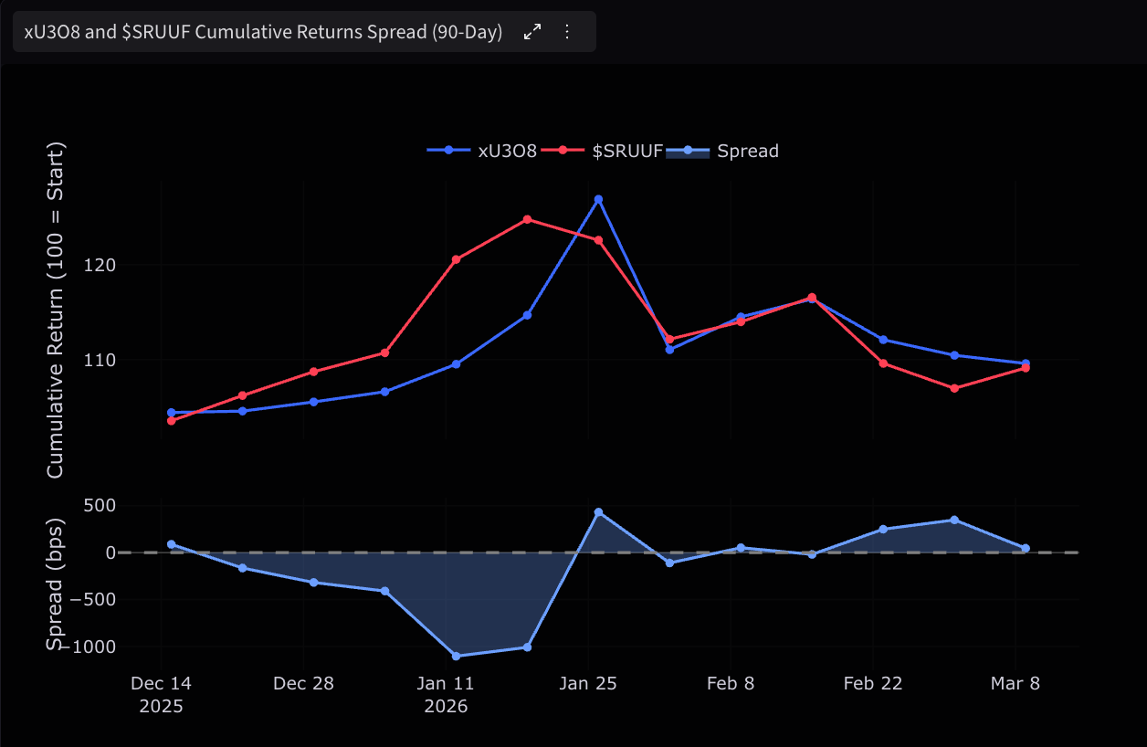 One of the more differentiated sections of the dashboard is the Real World Assets coverage. Tezos has emerged as a meaningful chain for tokenized real world assets, and the dashboard tracks this directly. The RWA section currently focuses on xU3O8, a tokenized uranium product built on Tezos, covering wallet count, on-chain usage trends, top contracts by transfer volume, and a 90-day cumulative returns comparison between xU3O8 and its traditional market equivalent, $SRUUF.