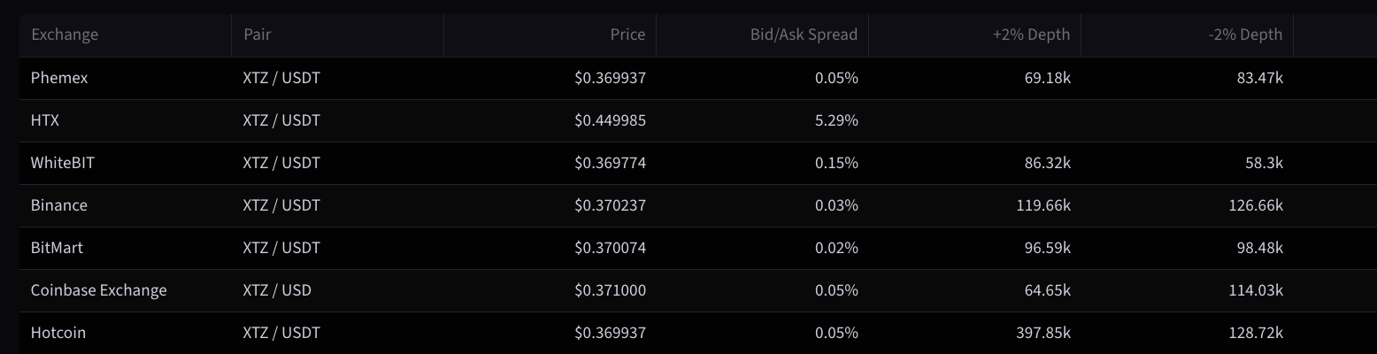 The Liquidity and Market Access section pulls together exchange-level data for XTZ across all major trading venues, including bid/ask spreads, market depth, and 24-hour volume by exchange. It also shows the exchange net flows chart to track how XTZ is moving on and off exchanges over time. For investors assessing execution quality or monitoring market structure, this section provides the data they need in one view. Some snippets: